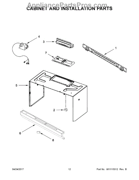 The Upper Cabinet Template is an OEM part for Whirlpool microwaves. This template is used during the installation of the microwave to ensure correct placement and alignment within the upper cabinet, providing guidance for drilling holes and securing the microwave in place.