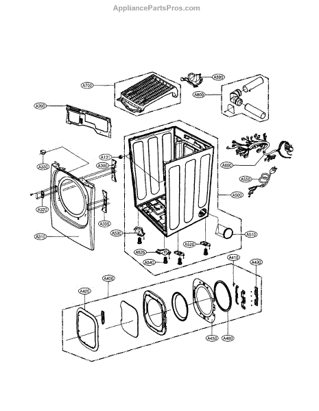 Wire harness for dryers. Connects electrical components inside the cabinet. Replace if wires are frayed, damaged, or connectors are broken or melted.