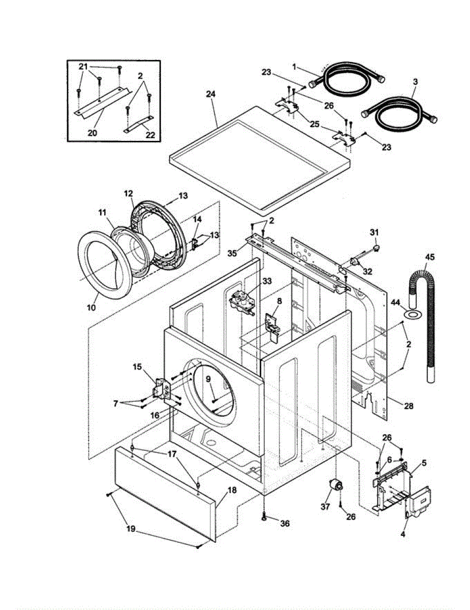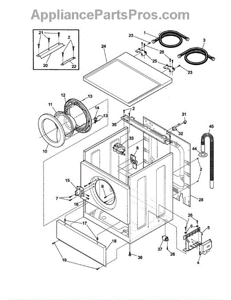 The Washer Drain Hose is an OEM replacement part for Frigidaire washing machines. It is a flexible, 7 ½ ft plastic hose that connects the washer tub to the household drainage system. The drain hose removes water from the washer at the end of each cycle. Symptoms of a faulty drain hose include: