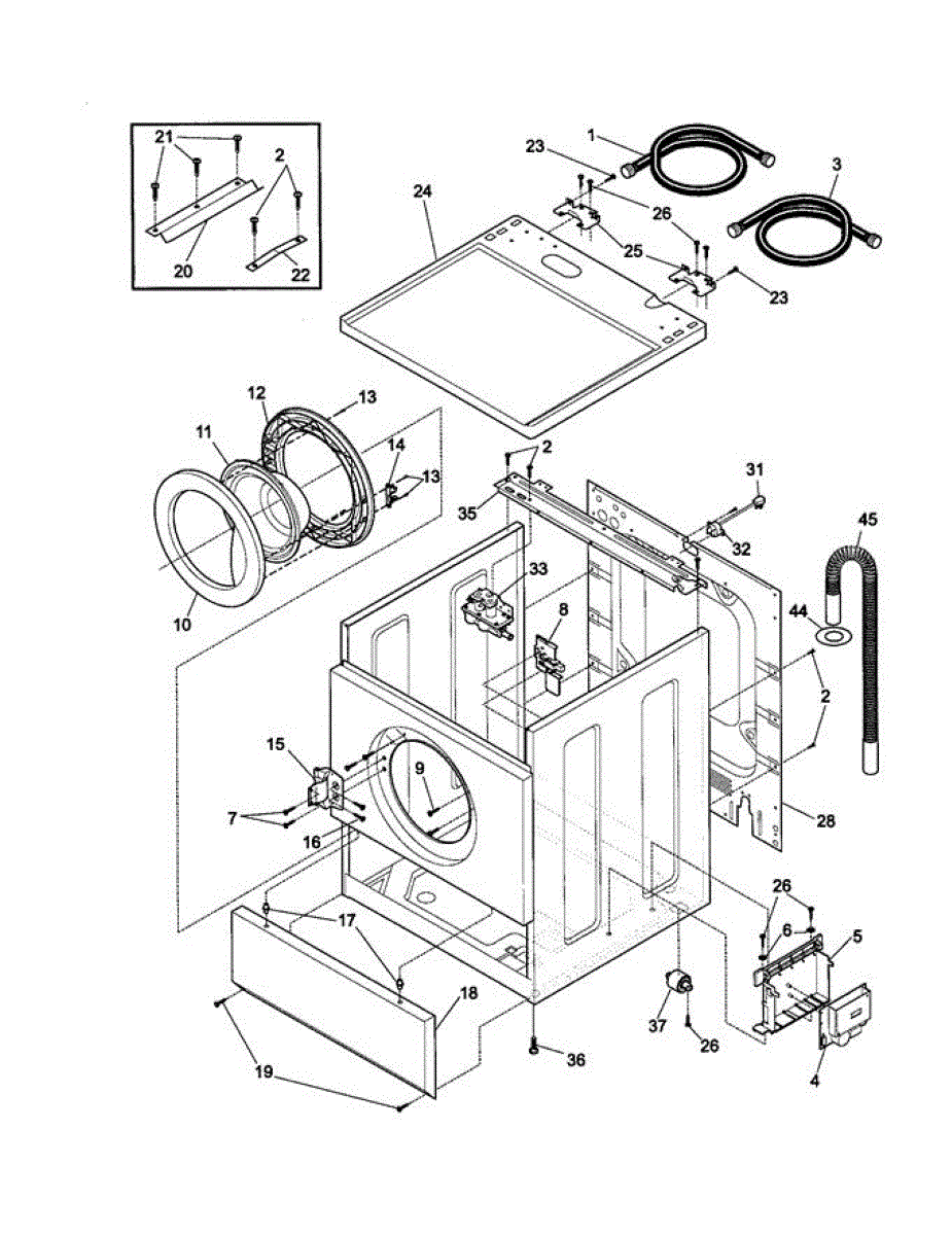 The Washer Drain Hose is an OEM replacement part for Frigidaire washing machines. It is a flexible, 7 ½ ft plastic hose that connects the washer tub to the household drainage system. The drain hose removes water from the washer at the end of each cycle. Symptoms of a faulty drain hose include: