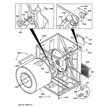 The Rear Drum Bearing Kit is an OEM part for GE dryers. The kit includes a rear bearing, shaft support, ball shaft, ball bearing, ball bearing retainer, high-temperature lubricant, and screws required for installation.