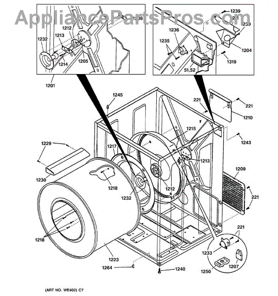 The Drum Support Bearing is an OEM part for GE dryers. This part allows the smooth rotation of the dryer drum. This small yet crucial component plays a pivotal role in the dryer's operation, supporting the back of the drum as it turns, and ensuring that clothes are dried evenly and efficiently.