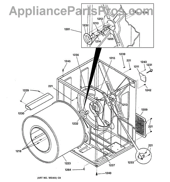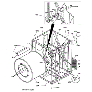 The Rear Drum Bearing Kit is an OEM part for GE dryers. The kit includes a rear bearing, shaft support, ball shaft, ball bearing, ball bearing retainer, high-temperature lubricant, and screws required for installation.