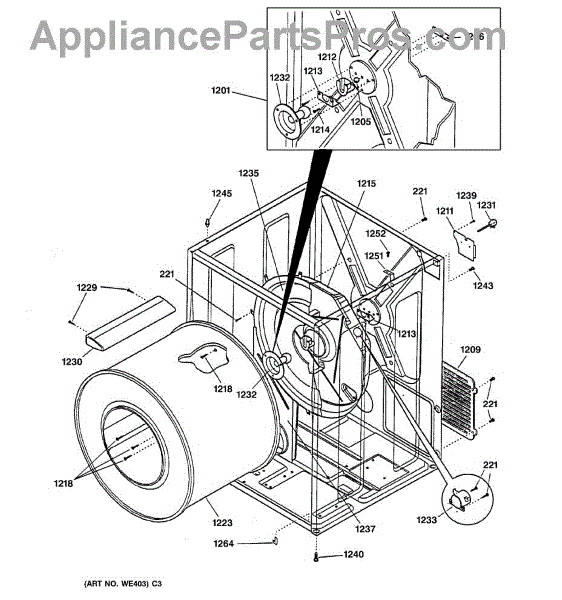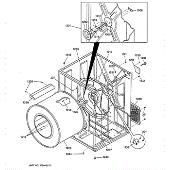 The Rear Drum Bearing Kit is an OEM part for GE dryers. The kit includes a rear bearing, shaft support, ball shaft, ball bearing, ball bearing retainer, high-temperature lubricant, and screws required for installation.