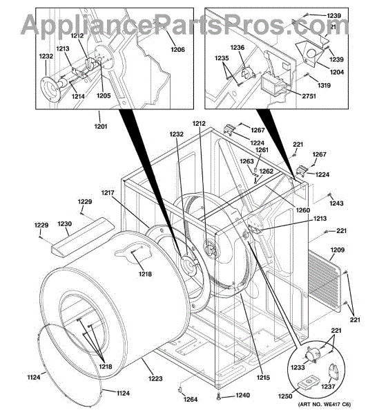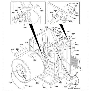 The Rear Drum Bearing Kit is an OEM part for GE dryers. The kit includes a rear bearing, shaft support, ball shaft, ball bearing, ball bearing retainer, high-temperature lubricant, and screws required for installation.
