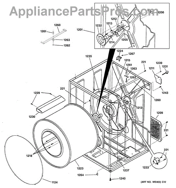The Rear Drum Bearing Kit is an OEM part for GE dryers. The kit includes a rear bearing, shaft support, ball shaft, ball bearing, ball bearing retainer, high-temperature lubricant, and screws required for installation.