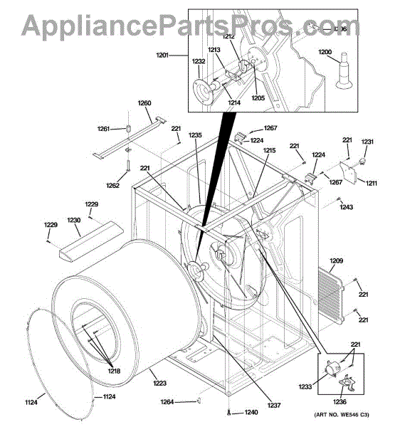 The Rear Drum Bearing Kit is an OEM part for GE dryers. The kit includes a rear bearing, shaft support, ball shaft, ball bearing, ball bearing retainer, high-temperature lubricant, and screws required for installation.