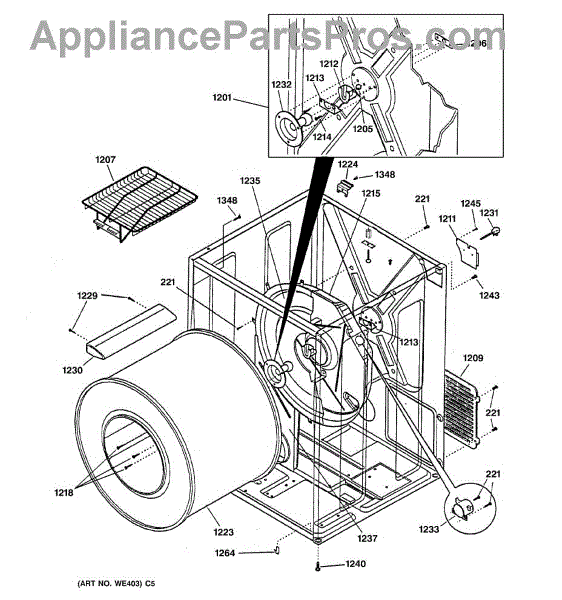 The Rear Drum Bearing Kit is an OEM part for GE dryers. The kit includes a rear bearing, shaft support, ball shaft, ball bearing, ball bearing retainer, high-temperature lubricant, and screws required for installation.