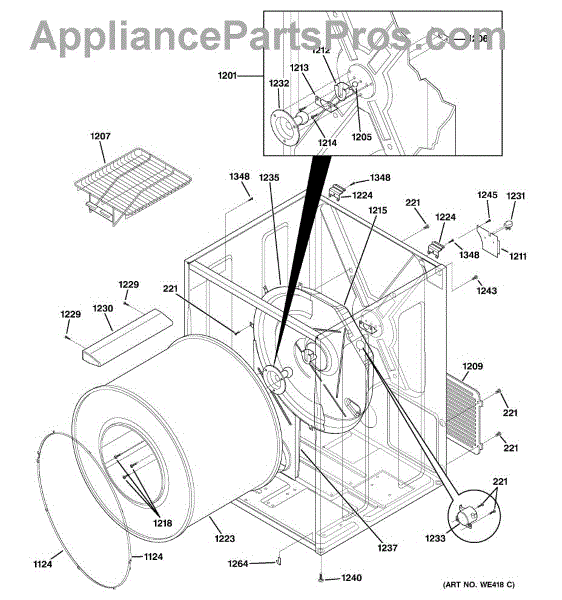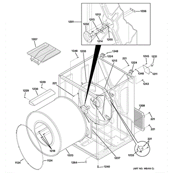 The Rear Drum Bearing Kit is an OEM part for GE dryers. The kit includes a rear bearing, shaft support, ball shaft, ball bearing, ball bearing retainer, high-temperature lubricant, and screws required for installation.