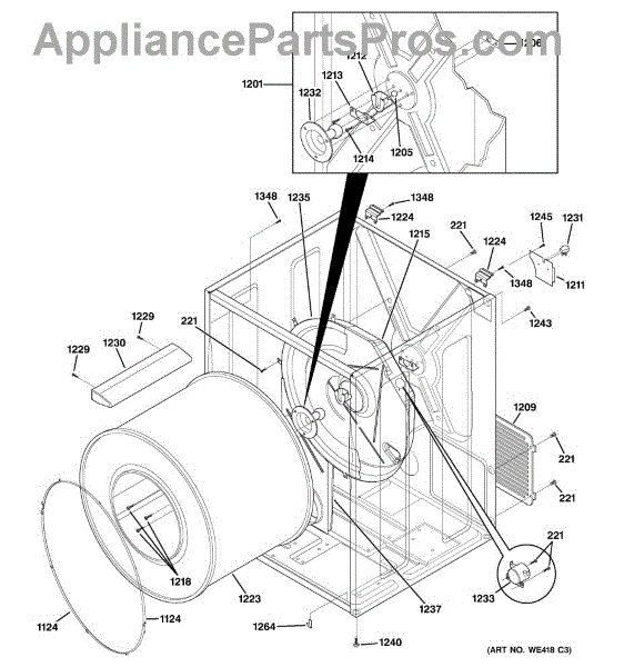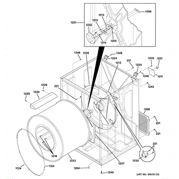 The Rear Drum Bearing Kit is an OEM part for GE dryers. The kit includes a rear bearing, shaft support, ball shaft, ball bearing, ball bearing retainer, high-temperature lubricant, and screws required for installation.