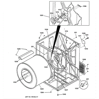 The Rear Drum Bearing Kit is an OEM part for GE dryers. The kit includes a rear bearing, shaft support, ball shaft, ball bearing, ball bearing retainer, high-temperature lubricant, and screws required for installation.