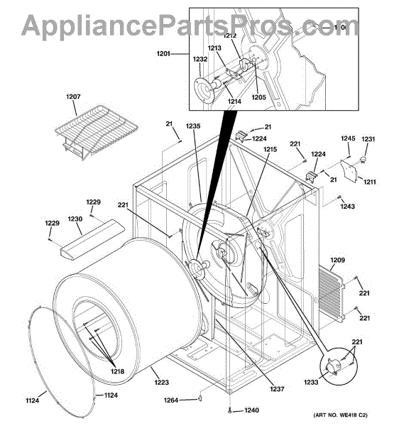 The Rear Drum Bearing Kit is an OEM part for GE dryers. The kit includes a rear bearing, shaft support, ball shaft, ball bearing, ball bearing retainer, high-temperature lubricant, and screws required for installation.