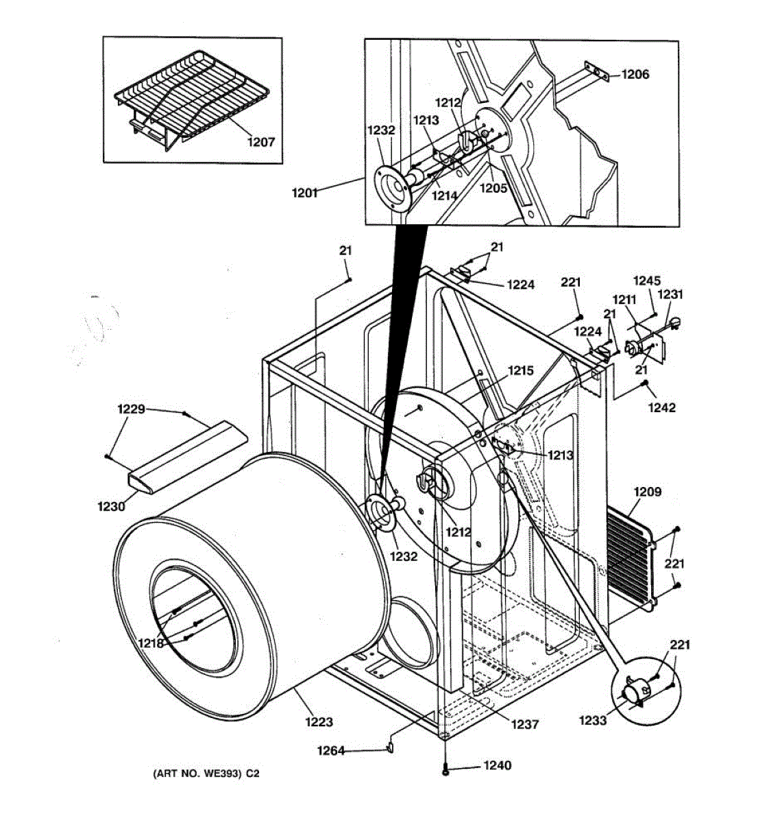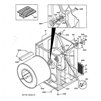 The Rear Drum Bearing Kit is an OEM part for GE dryers. The kit includes a rear bearing, shaft support, ball shaft, ball bearing, ball bearing retainer, high-temperature lubricant, and screws required for installation.