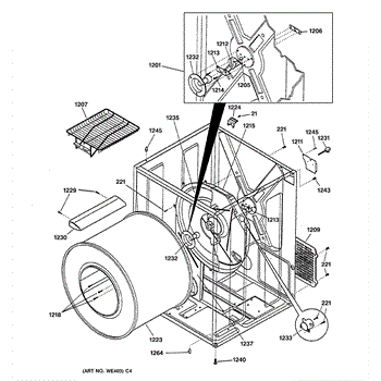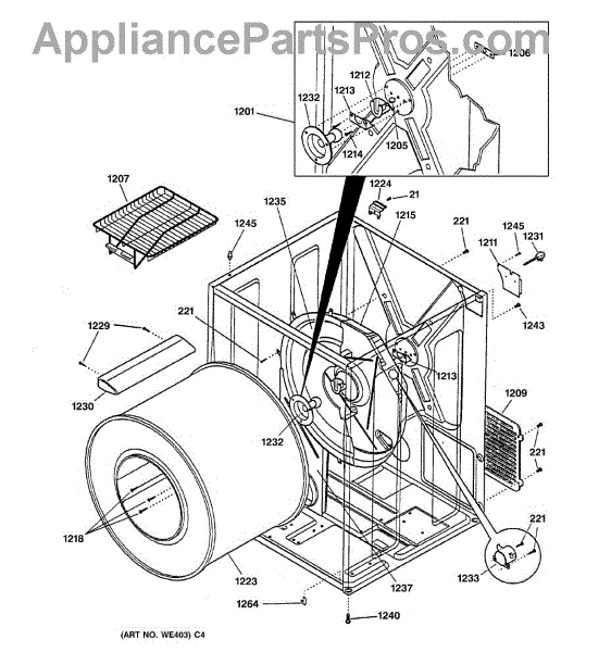 The Rear Drum Bearing Kit is an OEM part for GE dryers. The kit includes a rear bearing, shaft support, ball shaft, ball bearing, ball bearing retainer, high-temperature lubricant, and screws required for installation.