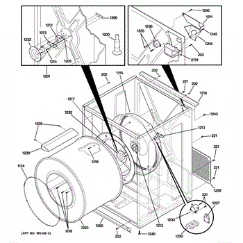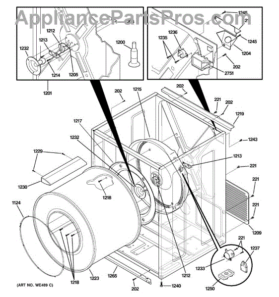 The Rear Drum Bearing Kit is an OEM part for GE dryers. The kit includes a rear bearing, shaft support, ball shaft, ball bearing, ball bearing retainer, high-temperature lubricant, and screws required for installation.