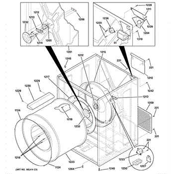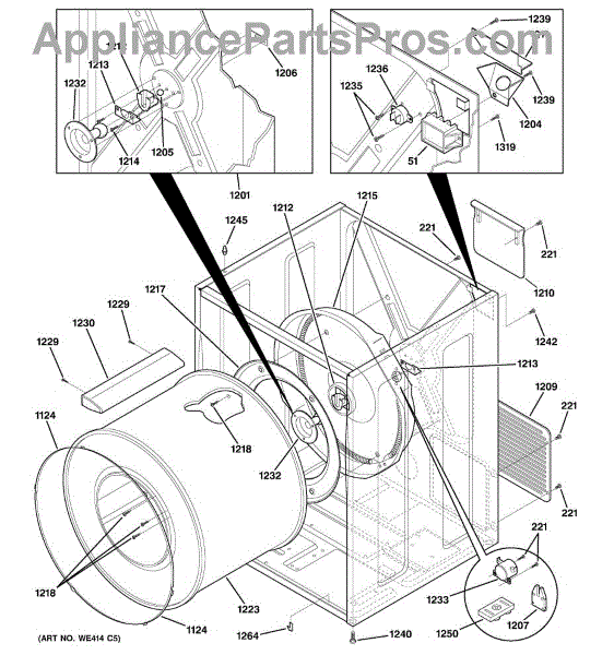 The Rear Drum Bearing Kit is an OEM part for GE dryers. The kit includes a rear bearing, shaft support, ball shaft, ball bearing, ball bearing retainer, high-temperature lubricant, and screws required for installation.