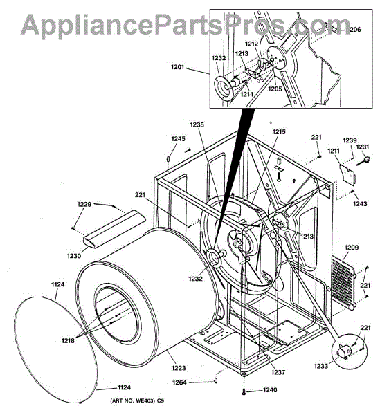 The Rear Drum Bearing Kit is an OEM part for GE dryers. The kit includes a rear bearing, shaft support, ball shaft, ball bearing, ball bearing retainer, high-temperature lubricant, and screws required for installation.