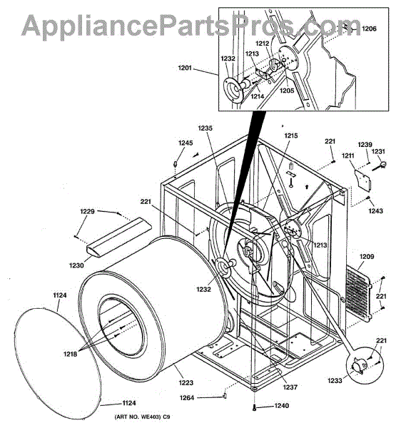 The Rear Drum Bearing Kit is an OEM part for GE dryers. The kit includes a rear bearing, shaft support, ball shaft, ball bearing, ball bearing retainer, high-temperature lubricant, and screws required for installation.