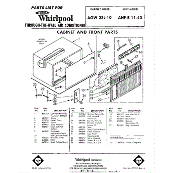 Parts for Whirlpool AHFE1140: 01 - Cabinet And Front Parts