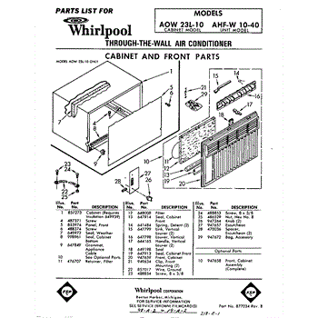 Parts for Whirlpool AHFW1040: 01 - Cabinet And Front Parts