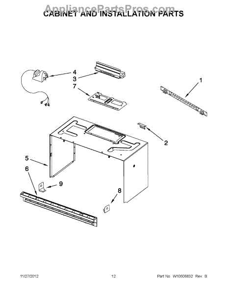 The Upper Cabinet Template is an OEM part for Whirlpool microwaves. This template is used during the installation of the microwave to ensure correct placement and alignment within the upper cabinet, providing guidance for drilling holes and securing the microwave in place.