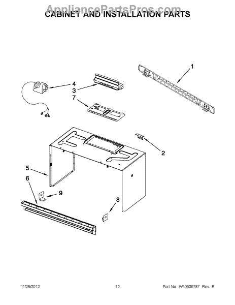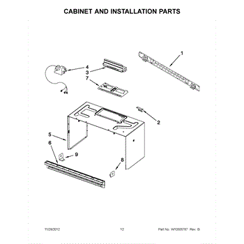 The Upper Cabinet Template is an OEM part for Whirlpool microwaves. This template is used during the installation of the microwave to ensure correct placement and alignment within the upper cabinet, providing guidance for drilling holes and securing the microwave in place.