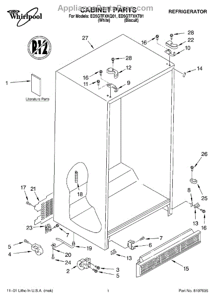 Biscuit-colored hinge cover for side-by-side refrigerators. Snaps onto door hinge to conceal hardware. Replace when cracked, discolored, or missing.