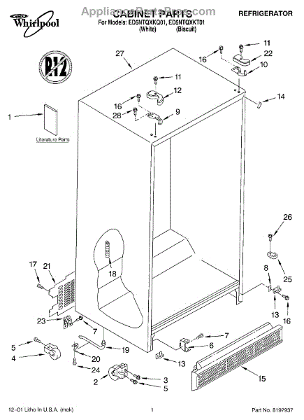 Biscuit-colored hinge cover for side-by-side refrigerators. Snaps onto door hinge to conceal hardware. Replace when cracked, discolored, or missing.