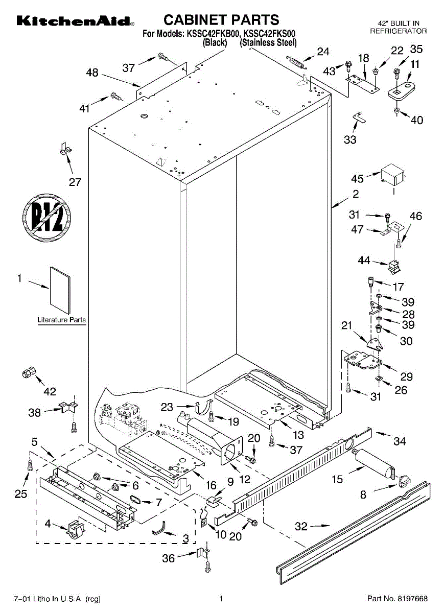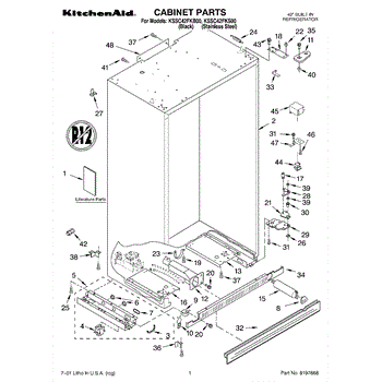 Support base bracket for side-by-side refrigerators. Mounts on the front left side to provide structural support. Replace if cracked or broken.