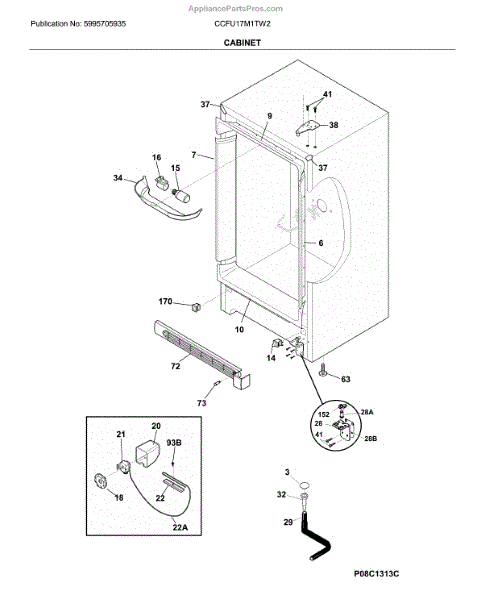 This door hinge supports and pivots the appliance door so it opens and closes smoothly. Replacing a worn or bent hinge restores alignment and sealing, helping prevent air leaks, frost buildup, and temperature fluctuations.