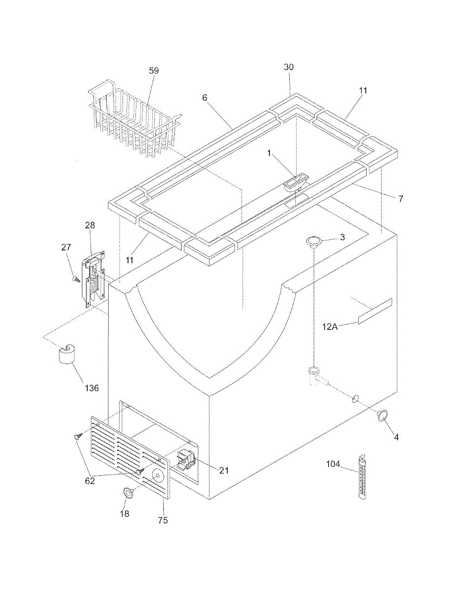 White access panel for chest and freestanding freezers. Covers internal components and provides service access. Replace if cracked, discolored, or missing.