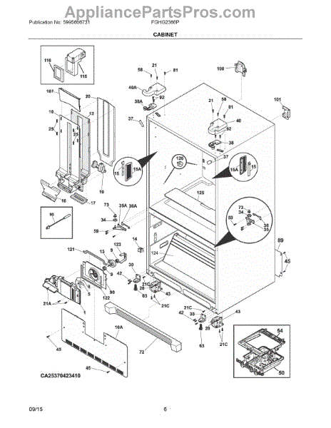 Foam insulation installs in refrigerator cabinet walls and interior surfaces. Replace if cracked, compressed, torn, or missing to restore efficiency.