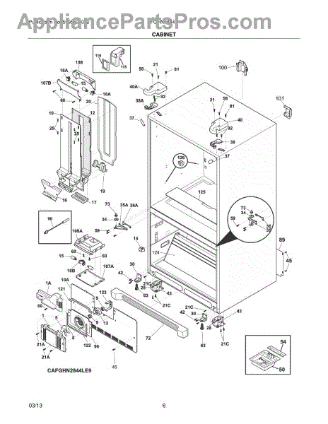 Foam insulation installs in refrigerator cabinet walls and interior surfaces. Replace if cracked, compressed, torn, or missing to restore efficiency.
