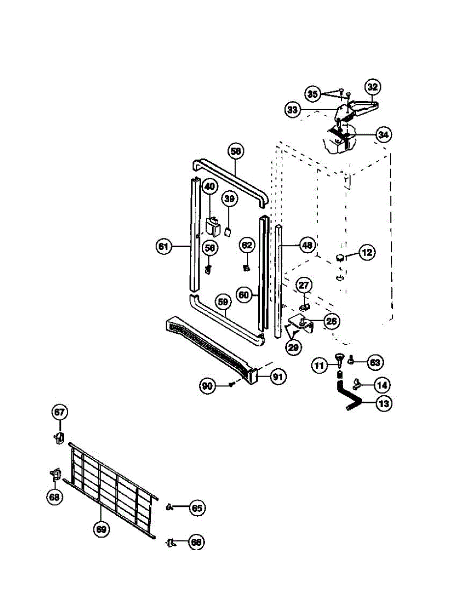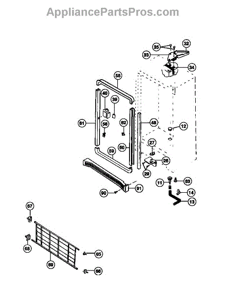 This top support (left) is a molded mounting bracket that secures the refrigerator cabinet or inner liner at the cabinet's upper-left corner to restore proper alignment and stable fit of the top section. It replaces a cracked, broken or missing upper-left support. What it does: