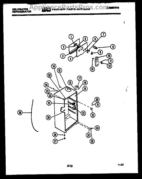 Almond cabinet corner trim piece for freezers. Replaces cracked, broken, or missing corner trim. Installs on exterior cabinet edges for a finished look.