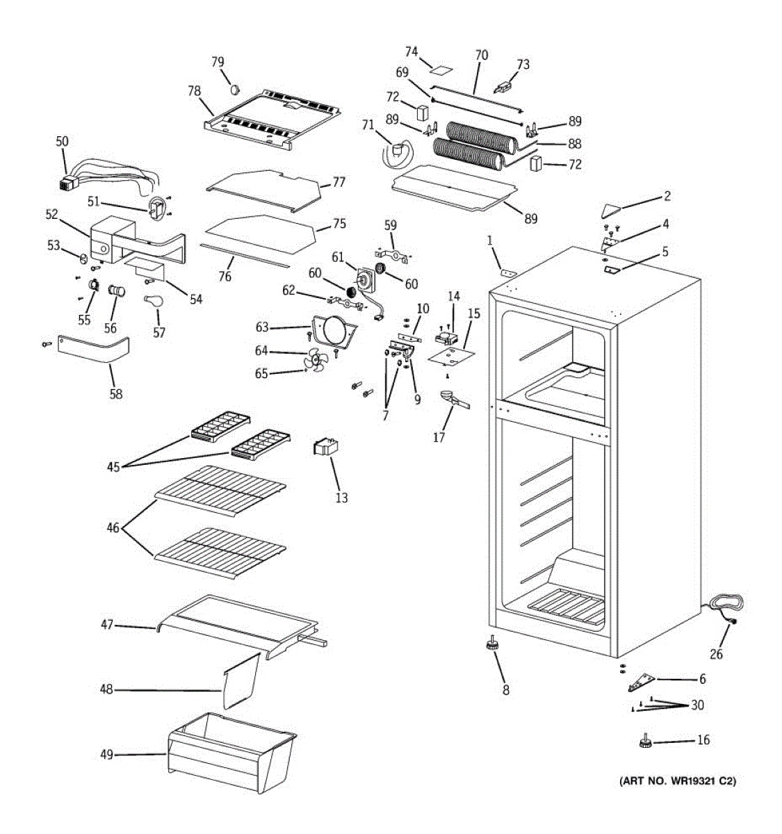 Supplies electrical power from wall outlet to refrigerator. Replace this cord if cut, frayed, overheated, or damaged to restore safe electrical connection.