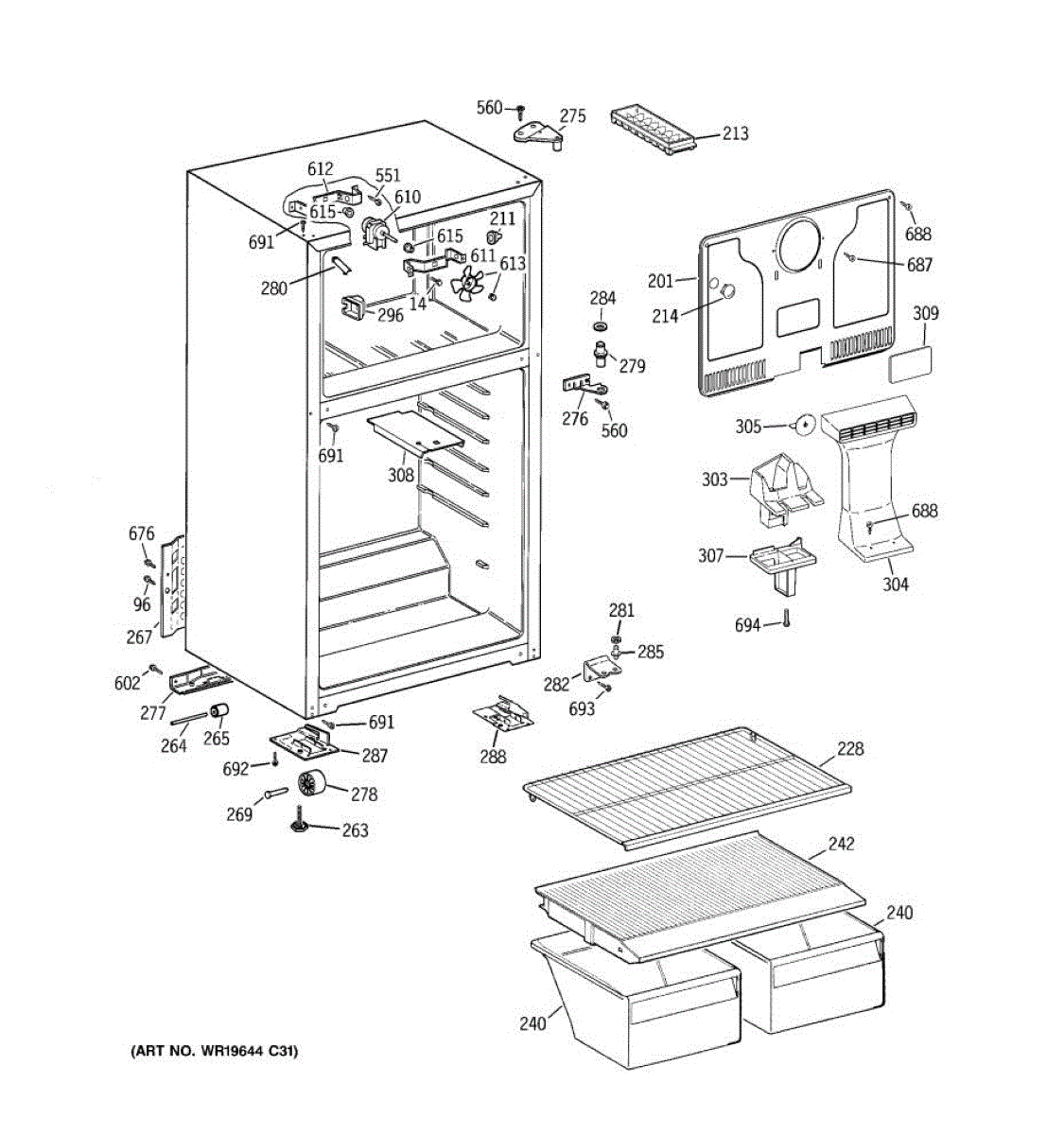 Secures the refrigerator door to the cabinet and provides a pivot point for smooth operation. Replace if cracked, worn, or causing misalignment.