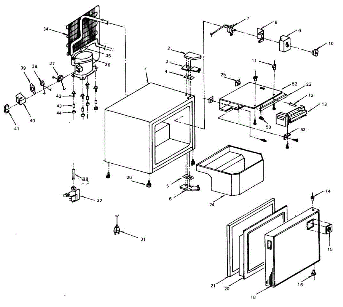 Supplies electrical power from wall outlet to refrigerator. Replace this cord if cut, frayed, overheated, or damaged to restore safe electrical connection.