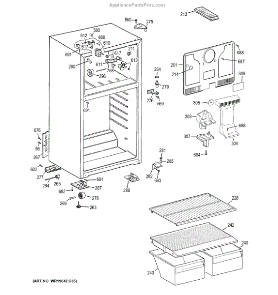 The Foam Duct is an OEM replacment part for GE refrigerators. It is an insulating conduit located within the fresh food compartment that helps direct chilled air circulation from evaporator coils throughout interior shelves and bins. The foam duct plays an important temperature regulation role by strategically venting cool air where needed. Causes can involve cracks in rigid duct walls, compressed insulation, or obstructions within the airflow pathway restricting proper circulation Symptoms of a defective duct include: