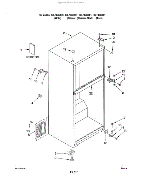 A factory fastener used to secure appliance components and panels. Replacing a missing, rusted, or stripped screw restores a solid, rattle-free fit and helps keep brackets, housings, and covers properly aligned for reliable operation.