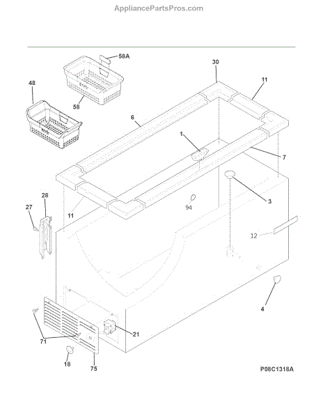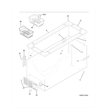 This full-width upper storage basket sits at the top of the freezer compartment. It hangs on the upper rails to keep smaller items organized and easy to reach, restoring usable space when the original basket is damaged or missing.