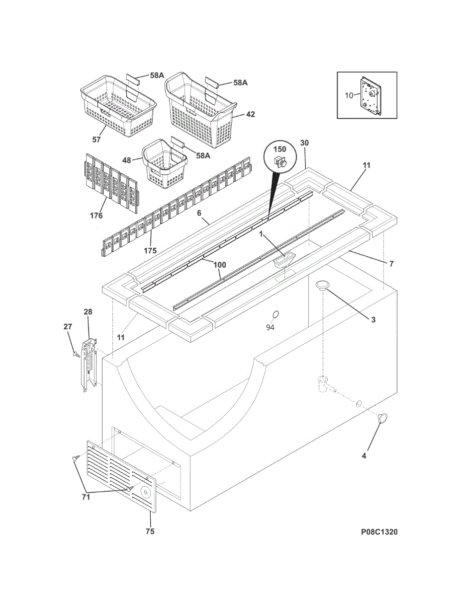 This full-width upper storage basket sits at the top of the freezer compartment. It hangs on the upper rails to keep smaller items organized and easy to reach, restoring usable space when the original basket is damaged or missing.