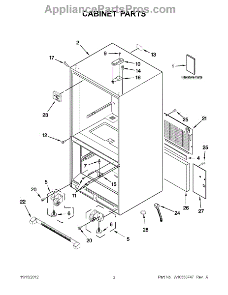 The Leveling Leg is an OEM replacement part for Whirlpool refrigerators. It is one of four legs situated internally at the base corners for proper tilt positioning. It raises or lowers each leg independently to stabilize units on uneven kitchen floors. Causes of replacement consist of wear from continual torque required during positioning processes. Thread damage or corrosion buildup attributable to floor locations over extended use necessitates periodic renewal as well. Symptoms involve: