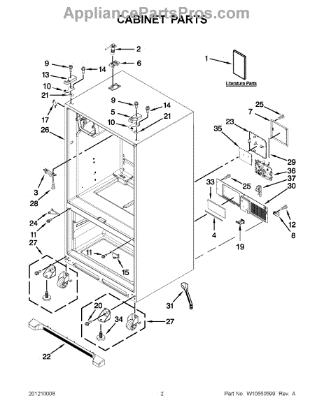 The Leveling Leg is an OEM replacement part for Whirlpool refrigerators. It is one of four legs situated internally at the base corners for proper tilt positioning. It raises or lowers each leg independently to stabilize units on uneven kitchen floors. Causes of replacement consist of wear from continual torque required during positioning processes. Thread damage or corrosion buildup attributable to floor locations over extended use necessitates periodic renewal as well. Symptoms involve:
