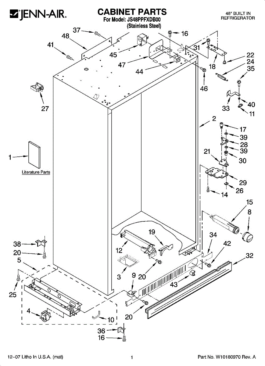 Support base bracket for side-by-side refrigerators. Mounts on the front left side to provide structural support. Replace if cracked or broken.