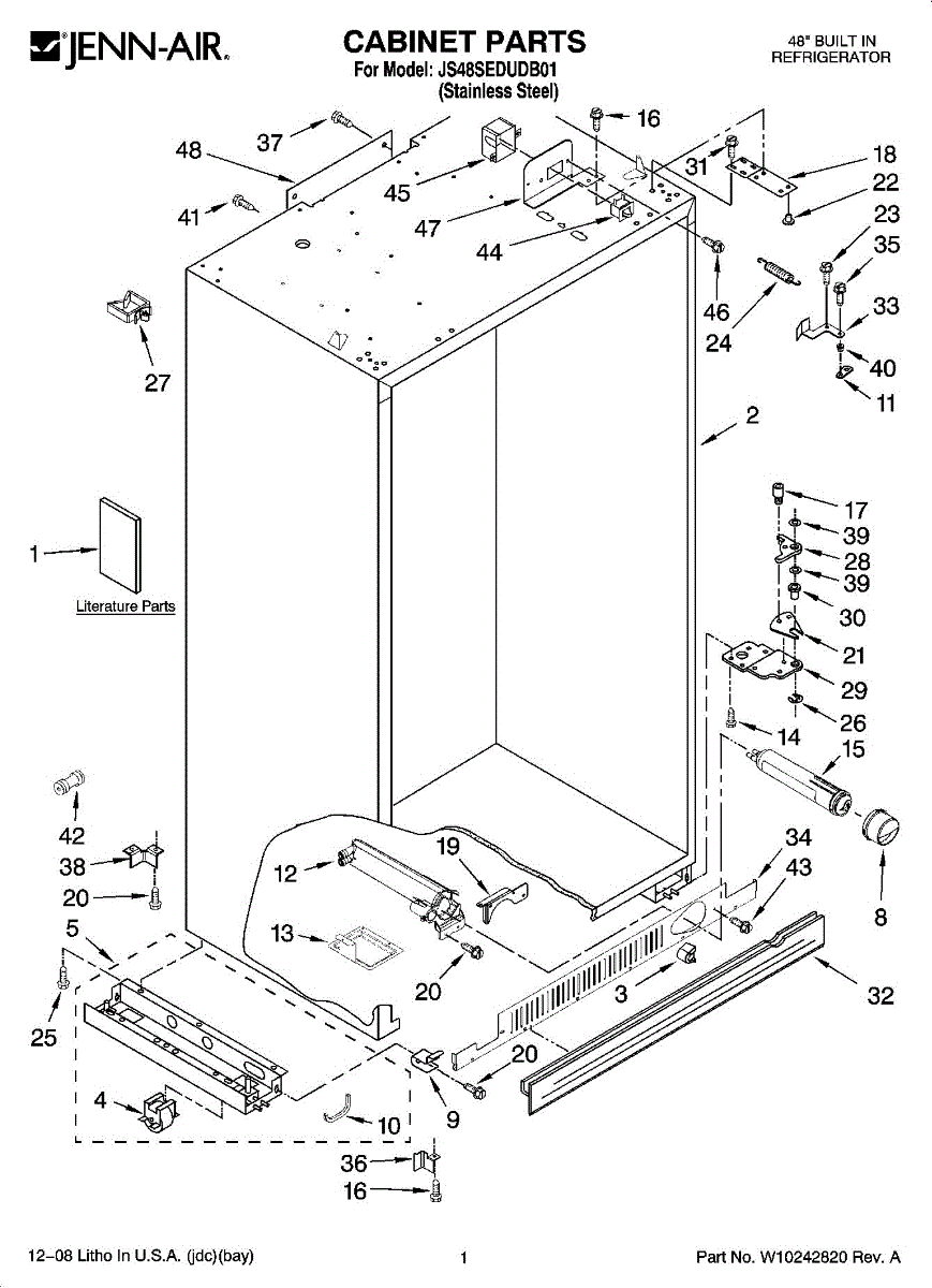 Support base bracket for side-by-side refrigerators. Mounts on the front left side to provide structural support. Replace if cracked or broken.