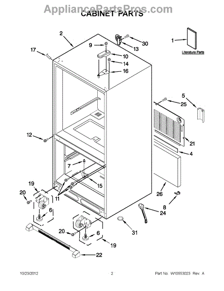 The Leveling Leg is an OEM replacement part for Whirlpool refrigerators. It is one of four legs situated internally at the base corners for proper tilt positioning. It raises or lowers each leg independently to stabilize units on uneven kitchen floors. Causes of replacement consist of wear from continual torque required during positioning processes. Thread damage or corrosion buildup attributable to floor locations over extended use necessitates periodic renewal as well. Symptoms involve: