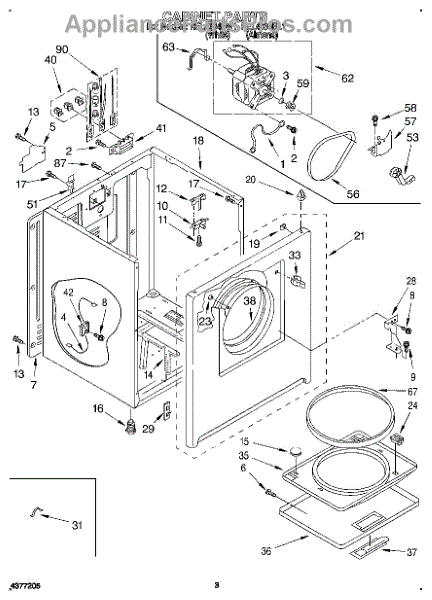 Fits all Whirlpool-made dryers (Whirlpool, Kenmore with prefix 110, Roper, KitchenAid, and Estate). Matching belt 341241 and rear support rollers 349241T. Whirlpool dryer repair manual 677818L.