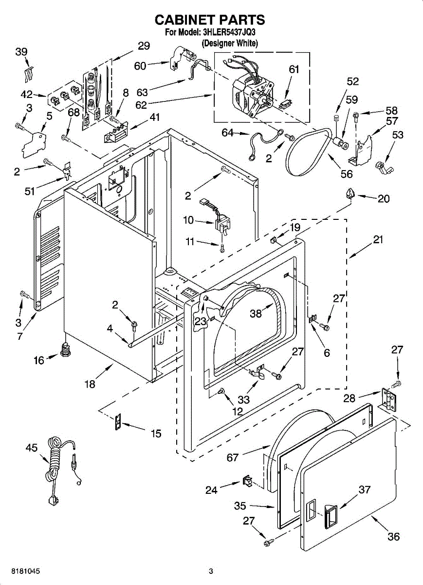 Dryer outer cabinet that houses internal components. Replace if your cabinet is rusted, dented, cracked, or damaged, compromising structural integrity.