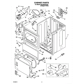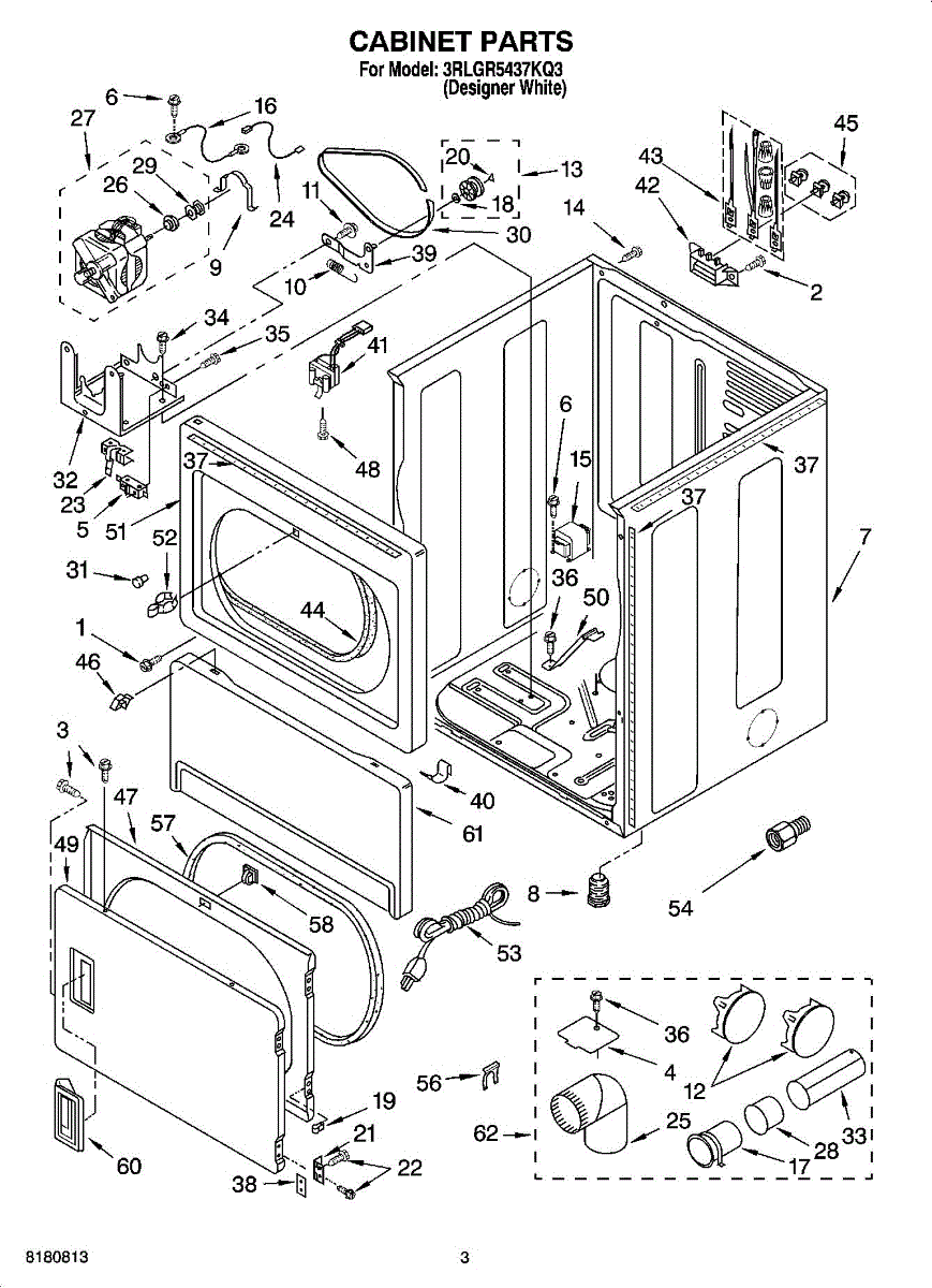 Cabinet housing for dryers. This outer shell encases internal components. Replace if cracked, rusted, dented, or structurally damaged from impact or wear.